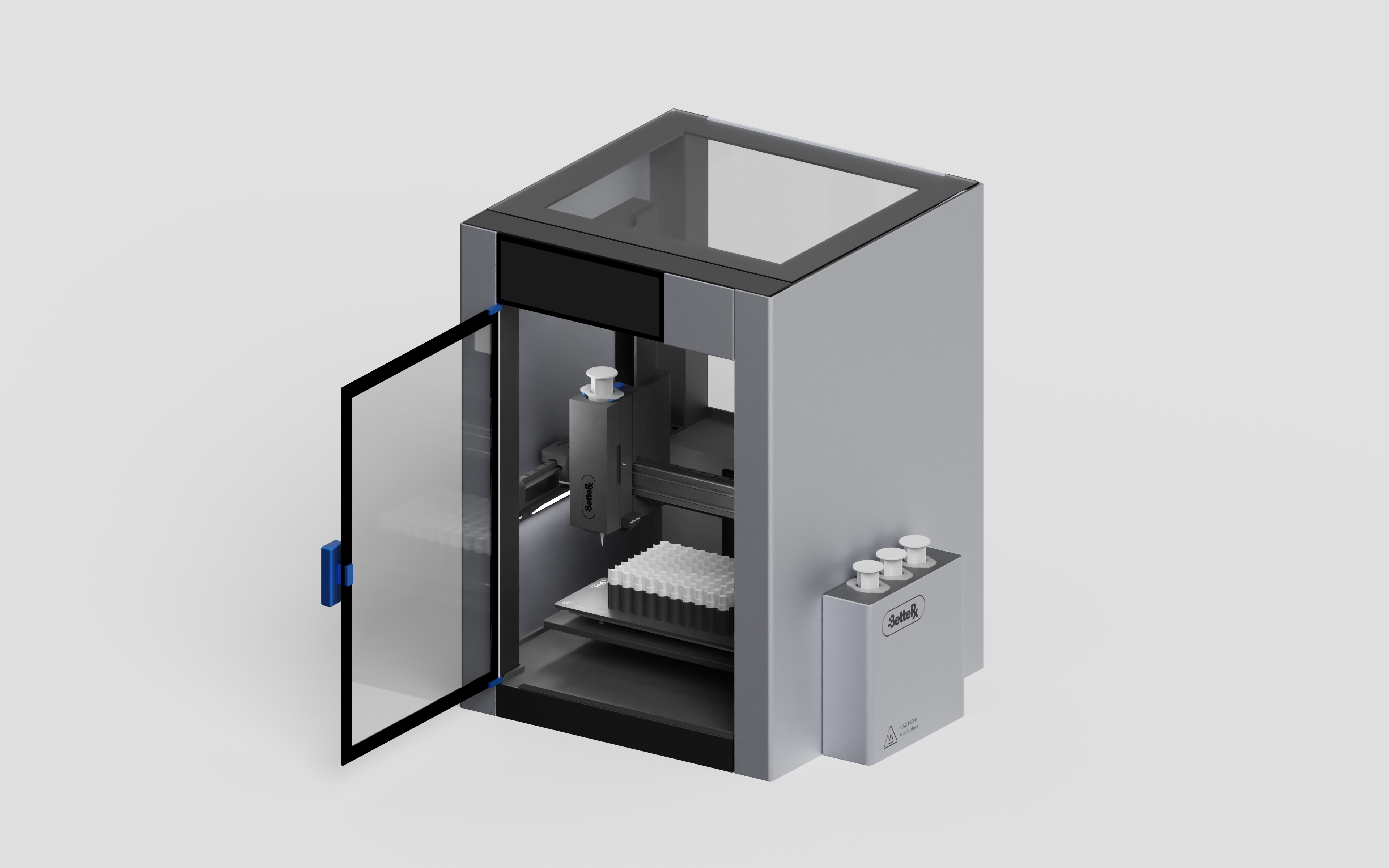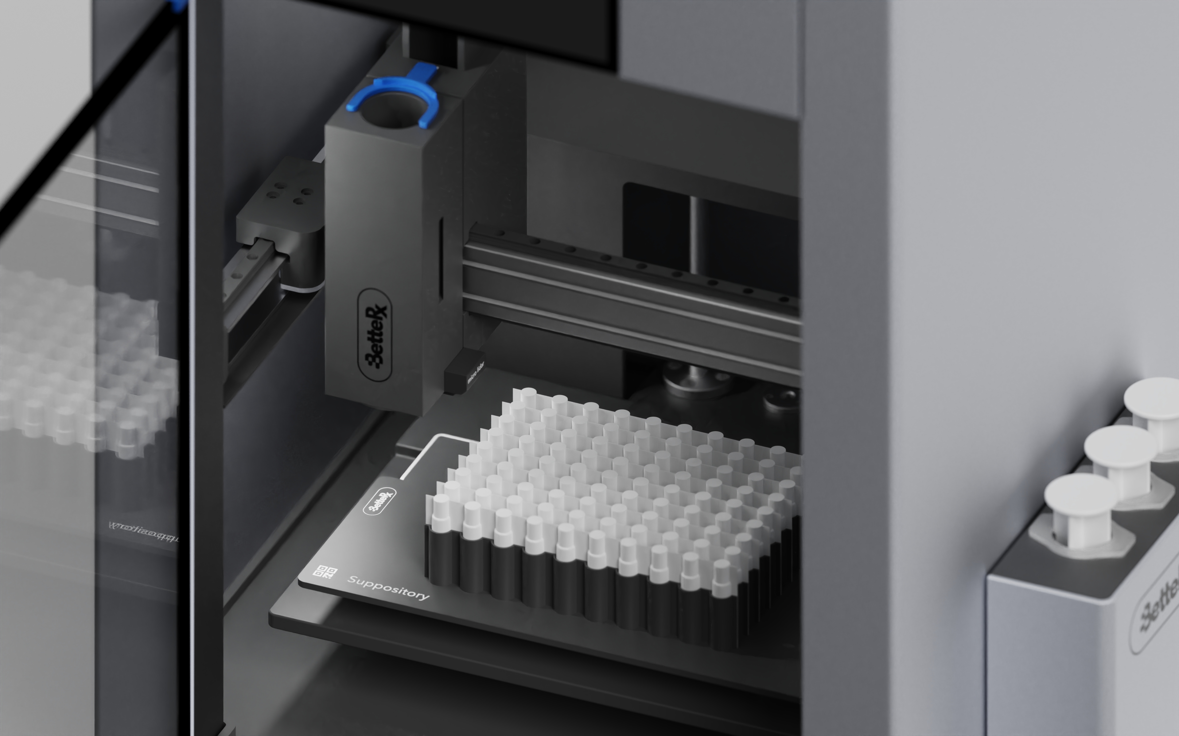 For BetteRx, we designed a bench-top compounding system intended to support pharmacists through automation. The system aids in the formation of pills, suppositories, troches, and similar dosage forms, addressing a complex and time-intensive step in pharmaceutical preparation.